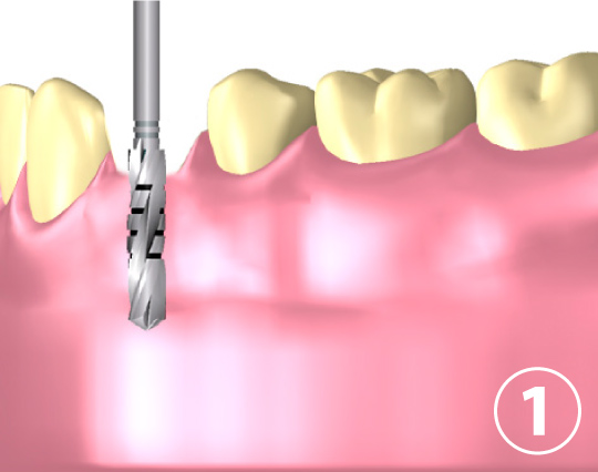 ①インプラントを入れる歯肉を切開してアゴの骨に穴を開け