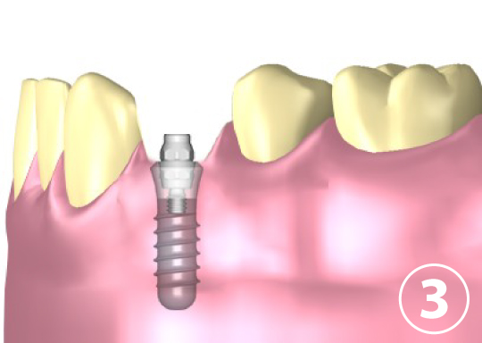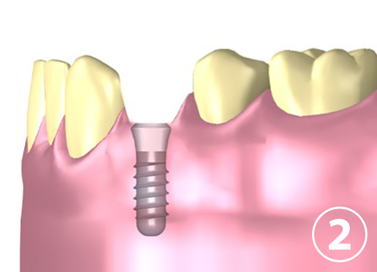 ②インプラントを埋め込みます。一次手術の後、インプラントとアゴの骨とが結合するのを待つために、約3から6ヶ月の治癒期間をおきます。 この期間は、仮の歯や義歯を使用する場合もあります。