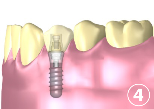 インプラントが結合した後に、③インプラントの頭の部分を歯肉から露出させ、そこにアバットメント(人工の歯を取り付ける支柱)を装着します。この状態で歯肉が治るまで、通常約1週間~6週間待ちます。