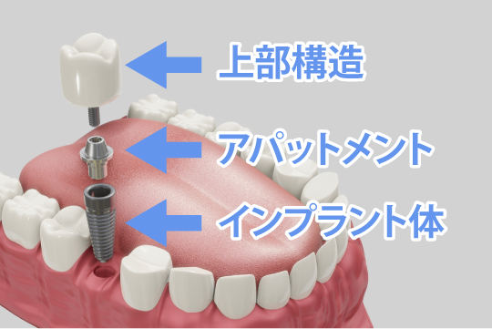 インプラントとは、歯を失った部位のアゴの骨にチタン製の土台を埋入し、その上に人工の歯をつけて噛み合せを回復する治療法です。 チタンは生体との親和性が高く、アゴの骨としっかり結合することが確認されています。